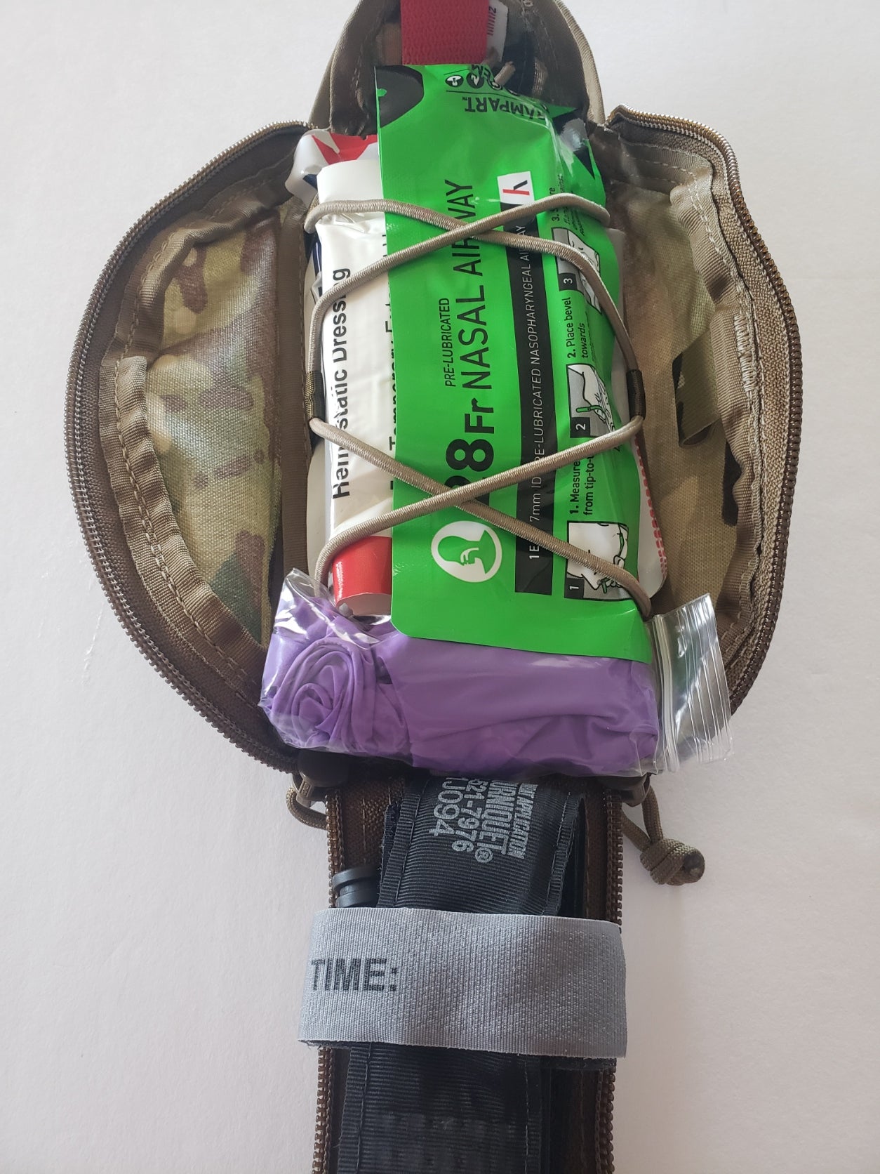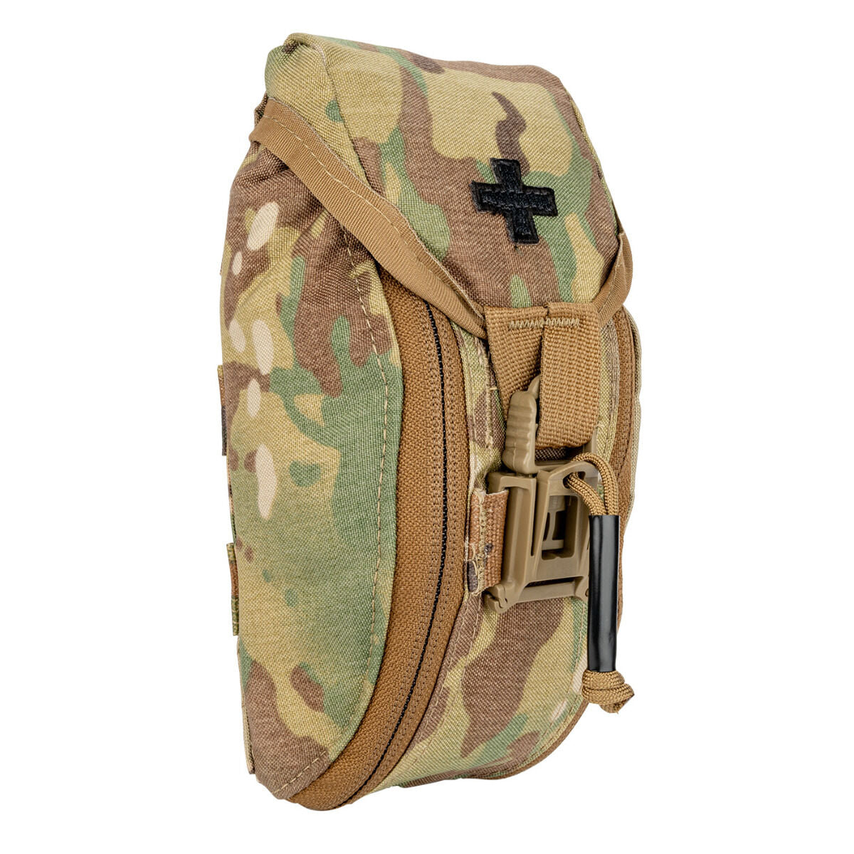 We're using the North American Rescue (NAR) "RIG Series Eagle IFAK" MOLLE/Belt Pouch in Multicam. It is a low-profile individual first aid kit designed with a protective hood and quick latch release to keep your life-saving equipment protected and rapidly accessible for deployment. Design advancements include easy-one hand quick release hood latch, handle and dual zippers to quickly open inner compartment and a detachable inner shock cord "MED PANEL" that detaches from the IFAK bag. The attachment system includes both vertical (MOLLE Attachment) and horizontal (3-inch Belt Loop Attachment) carry options. This is an awesome med pouch for securely carrying your TFAK supplies wherever the situation takes you.